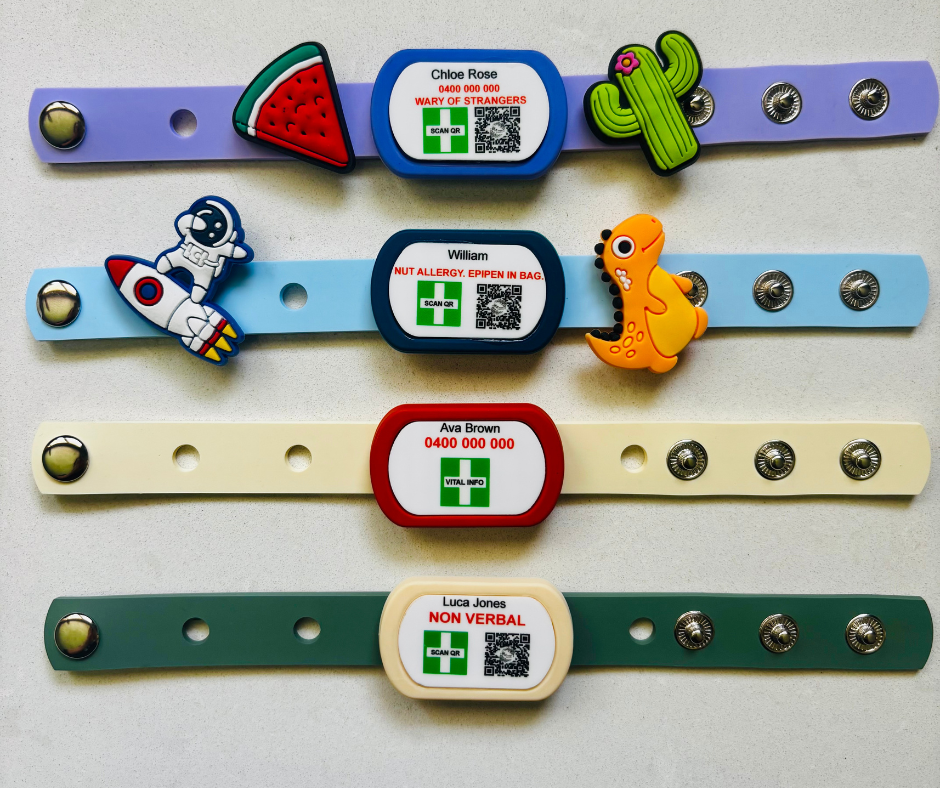 Keep your little one safe with our custom safety ID bracelet wristband for kids — perfect for child care, school, and family outings. Each soft, comfortable band includes a visible ID panel for allergies, conditions, or emergency contacts, and can be personalised with your child’s favourite Jibbitz® charms. Whether they’re exploring the playground or heading out on an excursion, this wearable safety tag ensures vital information is right where it’s needed — at a glance.